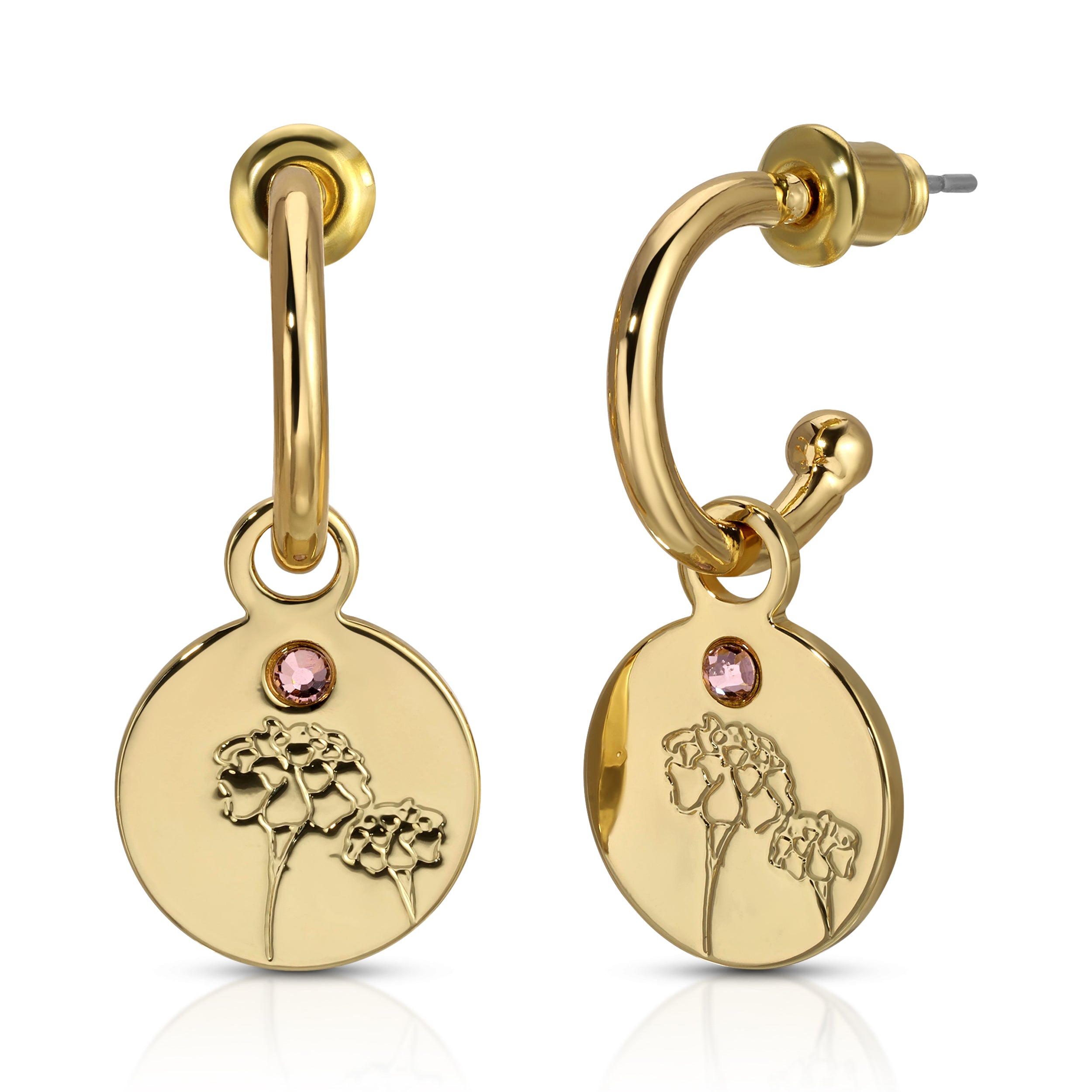 • 14k gold-dipped hoop earrings with engraved flower charm